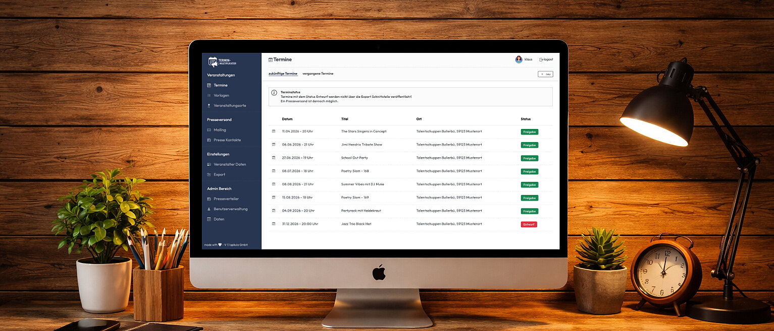 Der Terminmultiplikator ist eine Webanwendung in dem Veranstalter Ihre Termine pflegen können. Herzstück ist ein Presseverteiler, mit denen die Termine direkt an die Presse versendet werden können. Mehrere Filter sorgen automatisch für eine gefilterte Presseauswahl, damit Lokalredaktionen und Spartensender nur die relevanten Termine erhalten.
