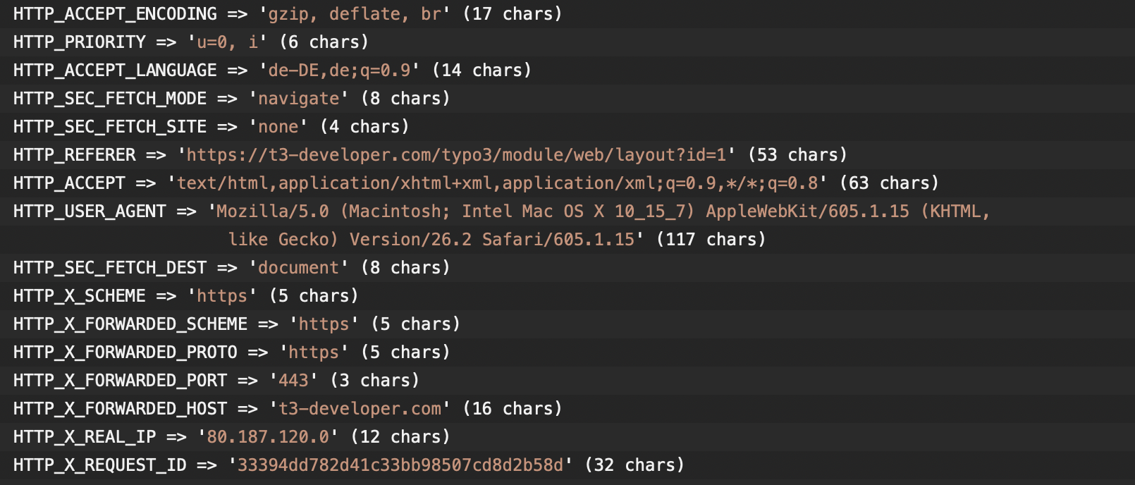 Aus den HTTP Header Daten des Requests brauchen wir nur den HTTP_USER_AGENT und HTTP_REFERER. Der HTTP_SEC_CH_UA_PLATFORM Header würde zwar direkt das Betriebssystem des Client liefern, wird aber leider nicht von allen Browsern unterstützt.